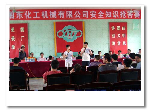 6月23日上午,我公司機(jī)安處舉辦了一期安全知識(shí)搶答賽,來自生產(chǎn)一線的容器隊(duì)、汽輪機(jī)隊(duì)等5個(gè)隊(duì)15名選手參加了比賽,以及50多名一線工人觀看了比賽。繼前期舉辦了外請人員觀看安全教育宣傳片、黑板報(bào)比賽、出一期宣傳櫥窗、張貼宣傳橫幅等活動(dòng)以來,這次比賽活動(dòng)將湘東化機(jī)6月安全月“關(guān)愛生命,安全發(fā)展”主題活動(dòng)再次推向了高潮。經(jīng)過2個(gè)小時(shí)的激烈角逐,汽輪機(jī)隊(duì)以300分遙遙領(lǐng)先奪取了冠軍。