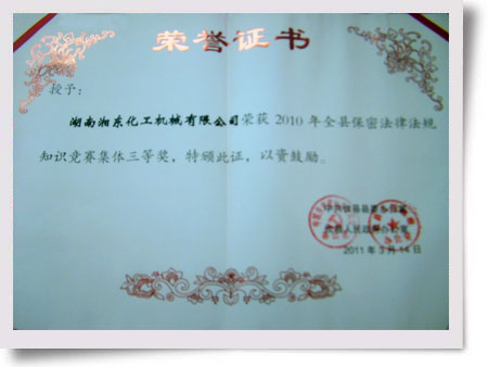 2011年3月17日,從攸縣縣委辦公室、攸縣人民政府辦公室傳來(lái)喜訊,我公司在2010年11月30日進(jìn)行的全縣保密法律法規(guī)知識(shí)競(jìng)賽中榮獲集體三等獎(jiǎng),獲得縣委、縣政府的表彰。